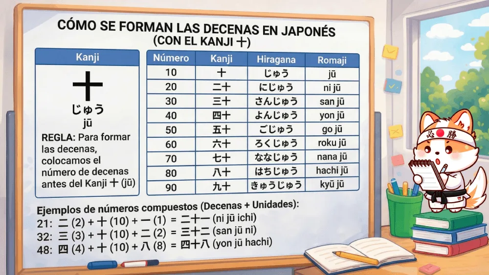 Para empezar, las decenas se forman con una regla muy sencilla: primero escribimos el número de decenas, seguido del Kanji de 10 (十) jū . Digamos que en esta pareja de números, el de la izquierda multiplica al de la derecha. Por ejemplo, 二十 (ni-jū), está formado por 二 (dos, ni) y por 十 (diez, jū). 二十 es entonces, “dos dieces”, ni-jū. Es decir, 20. De esta manera, solo debemos combinar este 十 (jū) con los números que ya hemos aprendido antes. Veamos cómo quedan: